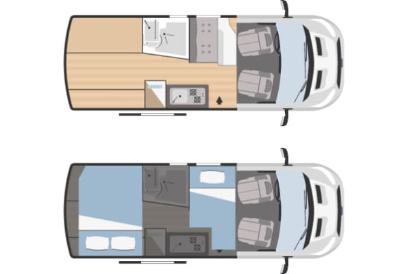 - Volkswagen Transporter T28 Startline 2018 This is a 4-berth campervan. The layout consists of a pop-top roof that sleeps 2, a pull-out rock-and-roll bed that sleeps 2, and a kitchen area with a sink, 2-burner gas hob, and fridge.