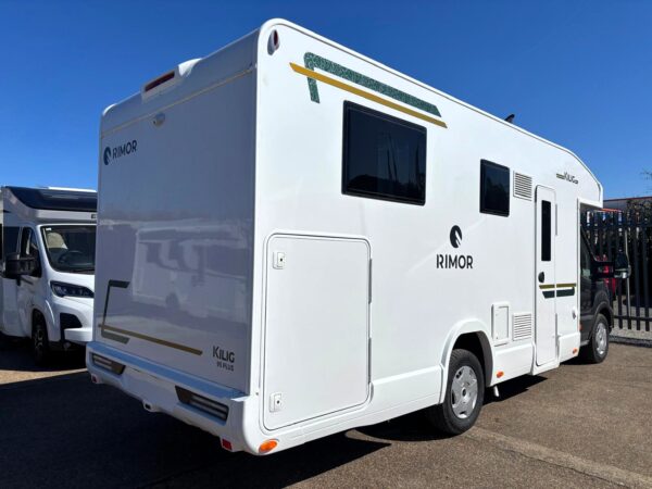 - Rimor Kilig 69 2026 A 5 berth motorhome with 5 travel seats. Consists of a rear double island bed, an electric drop-down double bed at the front and a L shape front dinette. Kitchen unit equipped with 3 burner hob, sink, and a 141L fridge with…