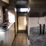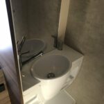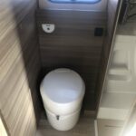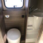 • The bathroom is equipped with a Thetford toilet, shower, and vanity washbasin